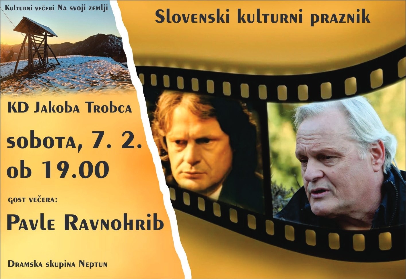 Če še nimate vstopnice za gala predstavo v Cankarjevem domu, ali pa vaš gvant ne dosega tamkajšnjih standardov, lepo povabljeni na prav tako kulturni večer, v soboto, 7. februarja ob 19.00 v KD Jakoba Trobca v Polhov Gradec, kjer bo naš gost Pavle Ravnohrib.