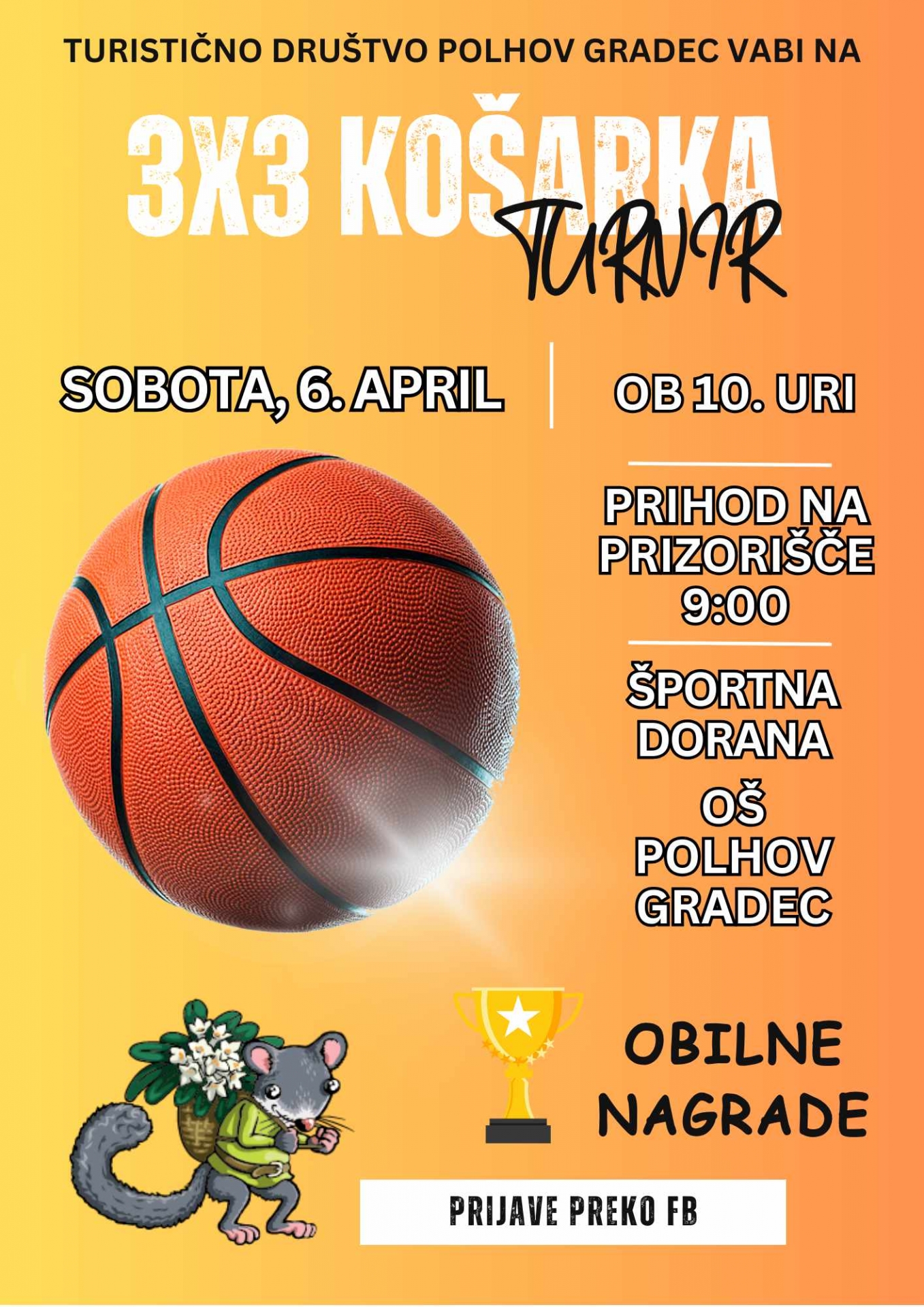 Turistično društvo Polhov Gradec vabi na košarkarski turnir, ki bo potekal v soboto, 6.4.2024, v športni dvorani OŠ Polhov Gradec.